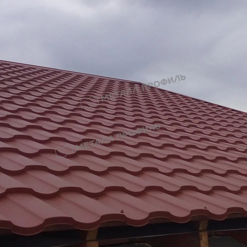 Профиль имитирует форму натуральной черепицы с плавными волнами и симметричными изгибами, высотой ступени 25 мм и шириной полезной поверхности 1100 мм. Такая геометрия обеспечивает легкость монтажа и отличную жесткость листа, предотвращая деформации под нагрузкой. В сравнении с другими профилями, этот вариант предлагает более выраженный рельеф, что создает визуальный эффект объемности на крыше, подчеркивая архитектурные особенности здания.